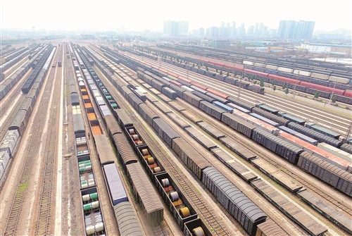 在火車徐州北站,一節(jié)節(jié)裝滿貨物的火車。