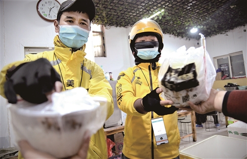 中午時(shí)分,煤建路上一家快餐店里取餐的外賣小哥。