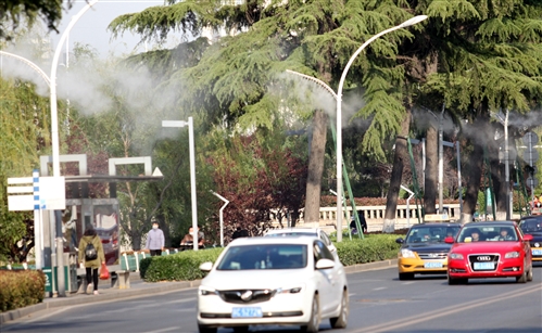 今年這個炎炎夏日,騎車或步行外出的市民,都很喜歡經(jīng)過西安路橋附近黃河南路兩側(cè)。這里600米范圍內(nèi)的39個路燈桿上都安裝了自動噴淋系統(tǒng),當(dāng)天氣干燥或者風(fēng)大的時候,就會自動向空中噴淋水霧?崾钪械男腥,突然置身于涼絲絲的水霧之中,怎一個“爽”字了得。