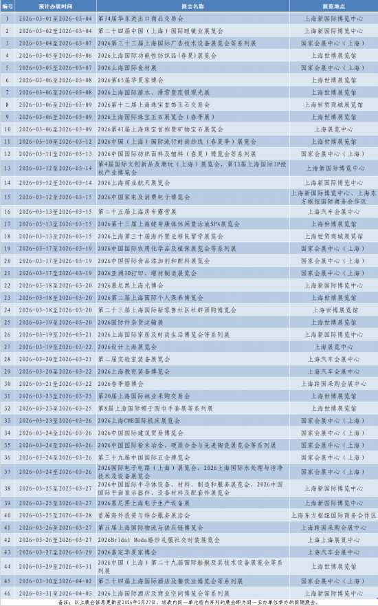 3月,上海將迎來46場(chǎng)各類展會(huì),同期,廣告、五金、食品、半導(dǎo)體等領(lǐng)域行業(yè)展會(huì)也將陸續(xù)舉辦。