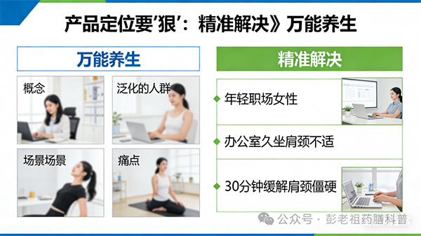 1. 產(chǎn)品定位要“狠”:與其做“萬能養(yǎng)生”,不如做“精準(zhǔn)解決”。錨定一個(gè)具體人群、一個(gè)具體場景、一個(gè)具體痛點(diǎn),比籠統(tǒng)的健康概念更能打動(dòng)消費(fèi)者。