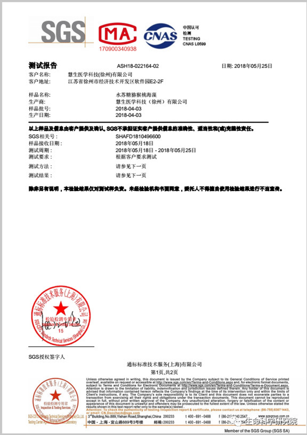 5月28號(hào),徐州慧生醫(yī)學(xué)研發(fā)的菌肽粉Ⅰ號(hào)、水蘇糖獼猴桃海藻沖劑兩項(xiàng)成果,順利通過(guò)國(guó)際SGS檢測(cè),各項(xiàng)指標(biāo)全部符合國(guó)際標(biāo)準(zhǔn)要求;標(biāo)志著這兩款填補(bǔ)了國(guó)際空白的科技成果,得到了國(guó)際專業(yè)機(jī)構(gòu)的鑒定,使得該產(chǎn)品能夠順利進(jìn)入世界所有國(guó)家和地區(qū),形成了真正走向世界的民族品牌。