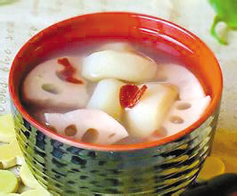 配料:荸薺250克,藕150克,冰糖適量。做法:荸薺洗凈去皮,藕洗凈切小塊。砂鍋加水適量,將荸薺、藕同入鍋內(nèi)文火煮燉20分鐘時(shí),加入如冰糖再燉10分鐘,起鍋即可食用。功效:清熱利濕,健脾開(kāi)胃。
