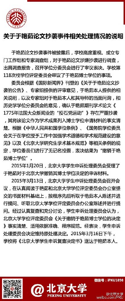 去年,“抄襲門”事件將北大歷史系女博士于艷茹置于輿論的風口浪尖。今年1月9日,北大通報撤銷其博士學位,再度引發(fā)公眾關注。于艷茹不服提交了撤銷博士學位的申訴,3月13日北京大學學生申訴處理委員會召開會議進行復查和討論,經表決,學生申訴處理委員會決定維持原處理決定。2015年3月16日下午,學校將《北京大學學生申訴復查決定書》送達于艷茹本人。