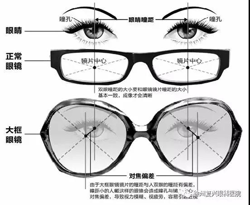 大框眼鏡的鏡片視覺中心距離很難與人本身的瞳孔間距保持一致;眼鏡的大框往往會造成鏡片的光學(xué)中心距離大于瞳孔間距,所以配戴者會出現(xiàn)視力下降、視野變小、斜視、頭昏等癥狀,配戴者戴的時間越久,近視度數(shù)越高,所產(chǎn)生的副作用也會越明顯。