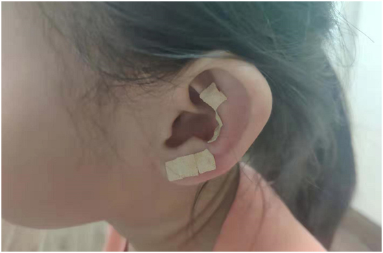 7月2日,離上次就診僅隔一周,來院復(fù)診的萌萌雙眼視力便已恢復(fù)到0.8。為更好的促進(jìn)孩子視力恢復(fù),徐曉欣主任聯(lián)合仁慈中醫(yī)科李懷洋醫(yī)生,為萌萌做了耳穴貼壓。
