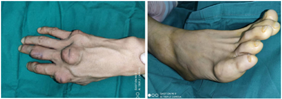 近期仁慈手外科四病區(qū)收治了一位43歲的男性患者,他的手上竟然長了好幾個乒乓球,不光手,雙下肢、腿、腳上多個部位都長出了大小不一的“石頭”、“乒乓球”、“饅頭”等,醫(yī)生通過手術從他身上取下9個大大小小的“乒乓球”, 觸目驚心。
