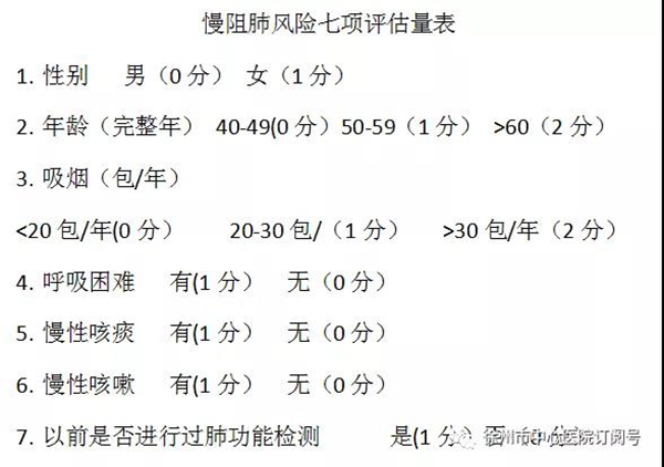 通過回答以下問題,總分5分以上者,考慮可能存在慢阻肺(適用于40歲以上的可疑慢阻肺患者),請(qǐng)盡早到醫(yī)療機(jī)構(gòu)進(jìn)行肺功能及影像學(xué)檢查。