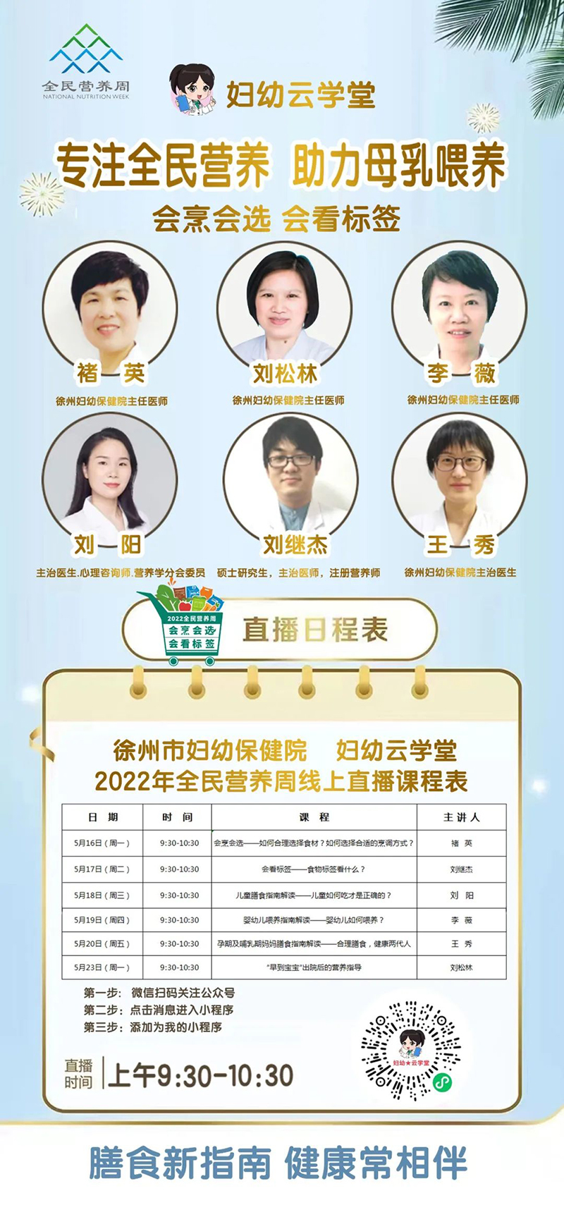 值此第七個(gè)全民營養(yǎng)周來臨之際,徐州市婦幼保健院、徐州市婦幼保健計(jì)劃生育服務(wù)中心于5月15日—5月21日,在全市社區(qū)衛(wèi)生服務(wù)中心(鄉(xiāng)鎮(zhèn)衛(wèi)生院)及托幼(育)機(jī)構(gòu)開展2022年全民營養(yǎng)周暨“5·20”中國學(xué)生營養(yǎng)日主題宣傳活動。