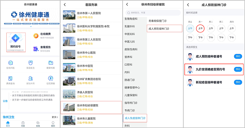 第三步:首頁預約掛號-徐州市婦幼保健院-成人免疫接種門診-成人預防接種門診-上午號段:九價宮頸癌疫苗預約號,共計225名額,約滿為止。掛號成功后,可在“徐州健康通”APP“我的掛號”中查詢到預約信息。掛號成功后不可退號,若退號視為自動放棄預約。