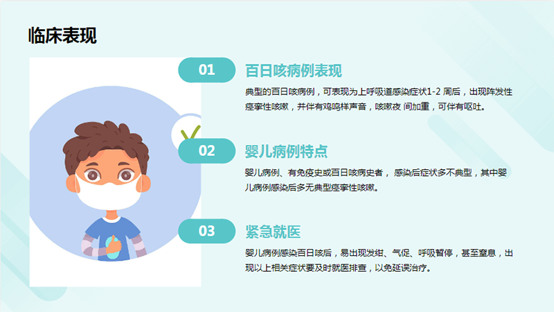 典型的百日咳病例,可表現(xiàn)為上呼吸道感染癥狀1-2 周后,出現(xiàn)陣發(fā)性痙攣性咳嗽,并伴有雞鳴樣聲音,咳嗽夜間加重,可伴有嘔吐。嬰兒病例、有免疫史或百日咳病史者,感染后癥狀多不典型,其中嬰兒病例感染后多無典型痙攣性咳嗽,易出現(xiàn)發(fā)紺、氣促、呼吸暫停,甚至窒息,出現(xiàn)以上相關癥狀要及時就醫(yī)排查,以免延誤治療。