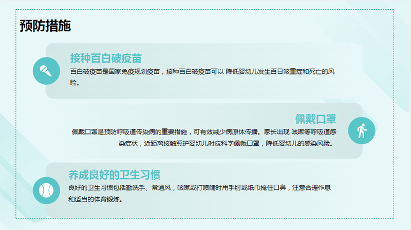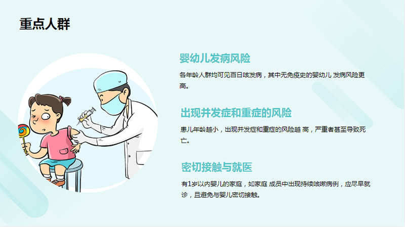 各年齡人群均可見百日咳發(fā)病,其中無免疫史的嬰幼兒發(fā)病風險更高;純耗挲g越小,出現(xiàn)并發(fā)癥和重癥的風險越高,嚴重者甚至導致死亡。有1歲以內(nèi)嬰兒的家庭,如家庭成員中出現(xiàn)持續(xù)咳嗽病例,應盡早就診,且避免與嬰兒密切接觸。
