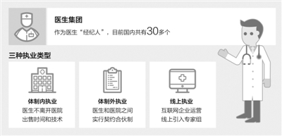 跳出體制創(chuàng)業(yè),在體制內(nèi)創(chuàng)業(yè),或是走到線上執(zhí)業(yè),醫(yī)生執(zhí)業(yè)形式在發(fā)生變化,醫(yī)生的“經(jīng)紀(jì)人”——醫(yī)生集團(tuán),逐漸引起社會的關(guān)注。