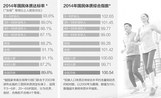 《公報》顯示,與2010年相比,我國國民體質(zhì)的總體水平有所增長。主要反映在兩個方面:2014年國民體質(zhì)總體合格率(即達到“合格”等級以上的人數(shù)百分比)增長了0.7個百分點,并且不同年齡、性別以及城鄉(xiāng)人群多呈現(xiàn)增長趨勢,特別是鄉(xiāng)村人群和女性的增長尤為明顯,反映了我國國民達到體質(zhì)測定標準“合格”等級以上的人口數(shù)增加;反映全人口體質(zhì)各指標總體變化程度的“國民體質(zhì)綜合指數(shù)”總體水平也有所提高,增長了0.15,從三大分類指數(shù)來看,身體機能指數(shù)和身體素質(zhì)指數(shù)均有所增長,其中身體機能指數(shù)增長1.13,增幅最大,身體素質(zhì)指數(shù)增長0.01。