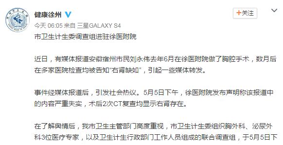 人民網(wǎng)北京5月6日電 據(jù)徐州市衛(wèi)生局官方微博消息,關(guān)于網(wǎng)絡(luò)報(bào)道“安徽男子術(shù)后右腎失蹤“一事,徐州市衛(wèi)計(jì)委已派出調(diào)查組進(jìn)駐徐醫(yī)附院進(jìn)行調(diào)查核實(shí)。