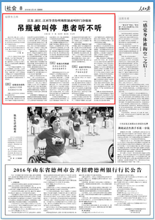 人民日報:江蘇等省份明確限制或叫停門診輸液