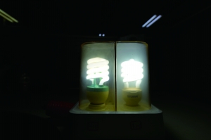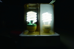 5.打開玻璃罩,從普通燈泡的空間里立即有股煙味冒出來,而“抗霾”燈泡的空間里幾乎聞不到煙味。