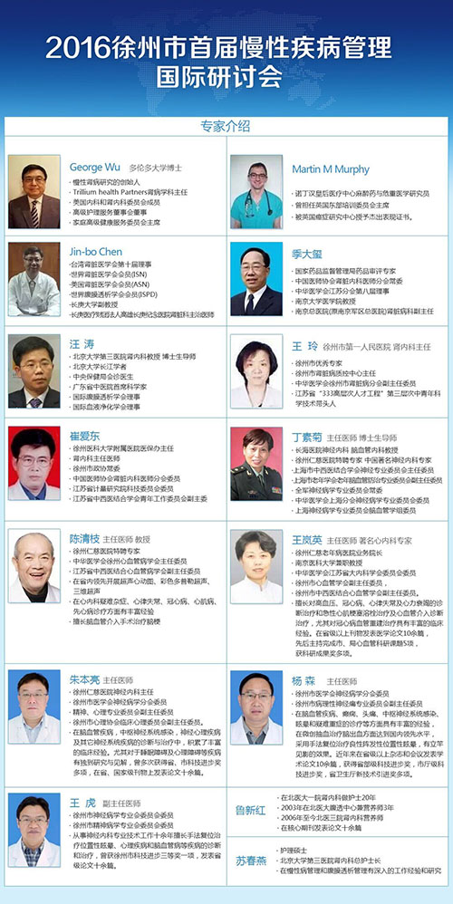 在慢病管理研討會上,徐州衛(wèi)計委副主任胡傳峰、北京大學(xué)長江學(xué)者汪濤教授、英國慢性病防控中心Martin Murphy教授、加拿大慢性病防控中心George Wu教授、臺灣高雄長庚紀(jì)念醫(yī)院腎臟科主任Jin-bo Chen教授分別作主題為基于醫(yī)聯(lián)體和信息化的家庭醫(yī)生簽約服務(wù)——徐州市慢性病一體化管理新模式探討、慢性病管理與醫(yī)聯(lián)體建設(shè)、慢病患者管理策略——英國經(jīng)驗、加拿大慢性病防控體系介紹、臺灣慢性病防控體系介紹的專題講座。
