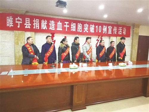 睢寧造血干細胞捐獻團隊。睢寧造血干細胞捐獻工作始于2002年,16年來,共有1125名志愿者加入中國造血干細胞捐獻者資料庫,存下了1125份的造血干細胞采樣。2011年7月,睢寧縣高作中學教師周保國成為該縣成功捐獻造血干細胞的第一人。目前,已有13位捐獻者成功捐獻了造血干細胞。據(jù)2017年省紅會統(tǒng)計數(shù)據(jù)顯示,睢寧縣造血干細胞成功捐獻率位居全市第一、全省第二。