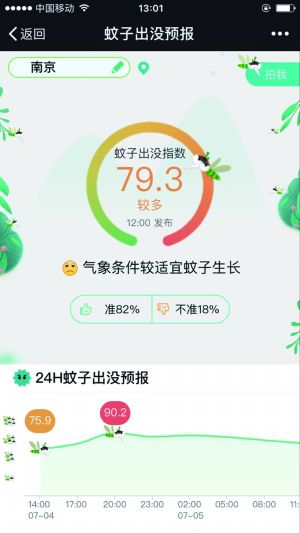 現(xiàn)代快報記者了解到,“蚊子出沒”綜合了氣象要素和蚊子生長的環(huán)境特點來給出預(yù)報,這個預(yù)報也是由江蘇省氣象服務(wù)中心聯(lián)合中國天氣網(wǎng)推出的基于位置的全國性預(yù)報。