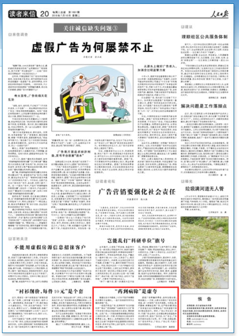 人民日報刊登連云港讀者來信:“藥到病除”是虛夸