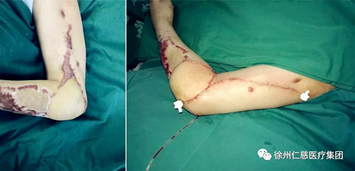 患者1年前車禍左上肢嚴(yán)重?fù)p傷,術(shù)后功能恢復(fù)良好,但留下疤痕。李發(fā)成教授、蔡博士與我院手外科鄭大偉主任聯(lián)合,采用脂肪填充+prp+手外科精細(xì)縫合的綜合治療方法,借助脂肪干細(xì)胞、PRP中的強(qiáng)大生長因子,促使組織再生,調(diào)節(jié)疤痕組織中細(xì)胞類型和比例,以及膠原纖維的類型及排列,有利于疤痕組織重塑形。