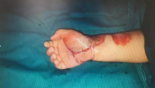 唐醫(yī)生手術(shù)團(tuán)隊(duì)給小患者實(shí)施了“右手、腕清創(chuàng)+右拇指血管神經(jīng)肌腱撕脫皮膚修復(fù)術(shù)”,術(shù)中去除手腕內(nèi)失活組織,取出傷口內(nèi)“油泥”樣異物,修剪創(chuàng)緣,修復(fù)撕裂的神經(jīng)血管肌腱,一次性通血成功。