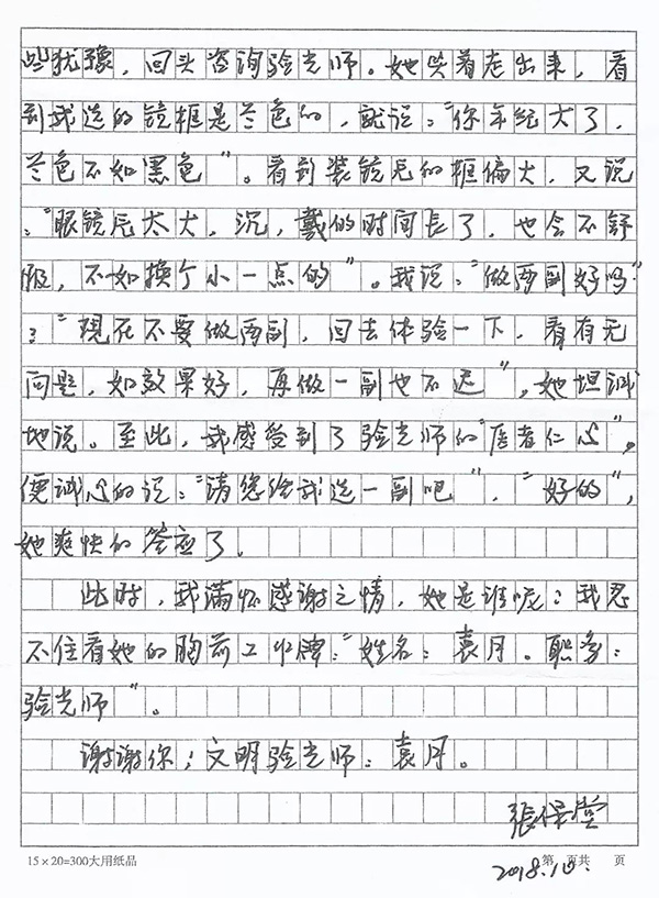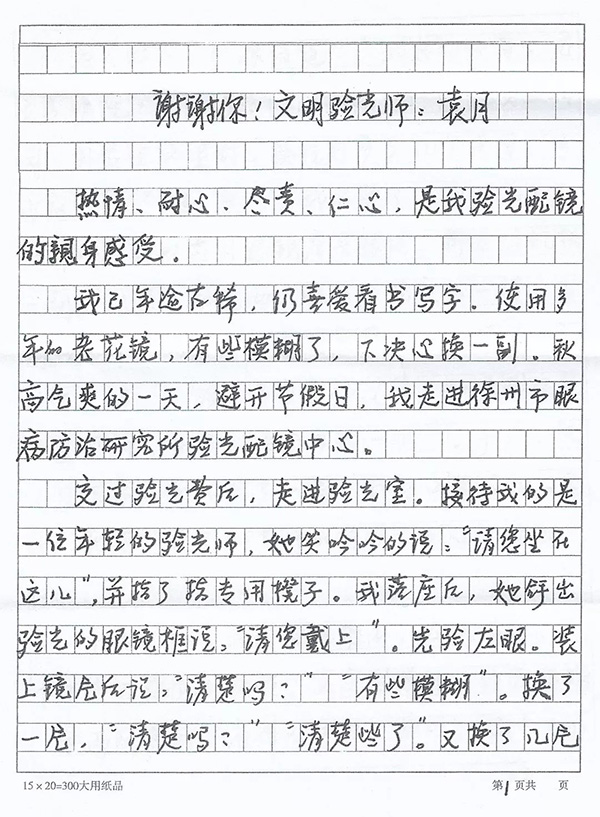 年逾古稀的顧客親筆信感謝徐州市第一人民醫(yī)院眼防所驗(yàn)光師袁月