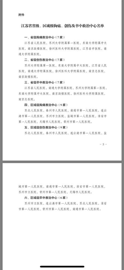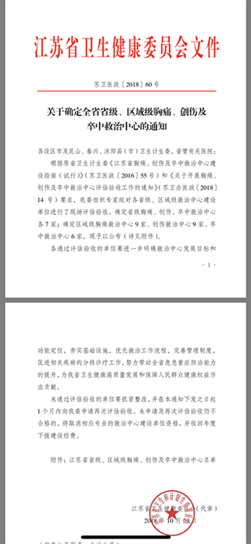 2018年10月29日,江蘇省衛(wèi)生健康委員會(huì)發(fā)布《關(guān)于確定全省省級(jí)、區(qū)域級(jí)胸痛、創(chuàng)傷及卒中救治中心的通知》,徐醫(yī)附院正式成為江蘇省省級(jí)胸痛、卒中、創(chuàng)傷救治中心。這標(biāo)志著徐醫(yī)附院歷時(shí)兩年的江蘇省省級(jí)三大救治中心建設(shè)順利結(jié)出碩果。