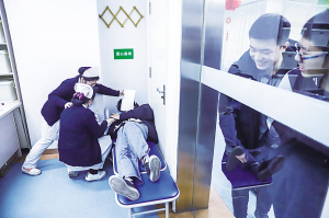 昨天上午在抽血現(xiàn)場(chǎng),一名高個(gè)子男生因?yàn)闀炨槪稍诹诵菹⒁紊闲菹。該男生說(shuō),他從小看到針頭就會(huì)暈,不舒服。剛才在排隊(duì)等候抽血時(shí),看到前面的同學(xué)抽血,就開(kāi)始難受。等排到自己的時(shí)候,就已經(jīng)全身虛脫了。護(hù)士把他扶到休息椅上,一位護(hù)士把他的眼睛蓋住,一位護(hù)士幫忙抽血。
