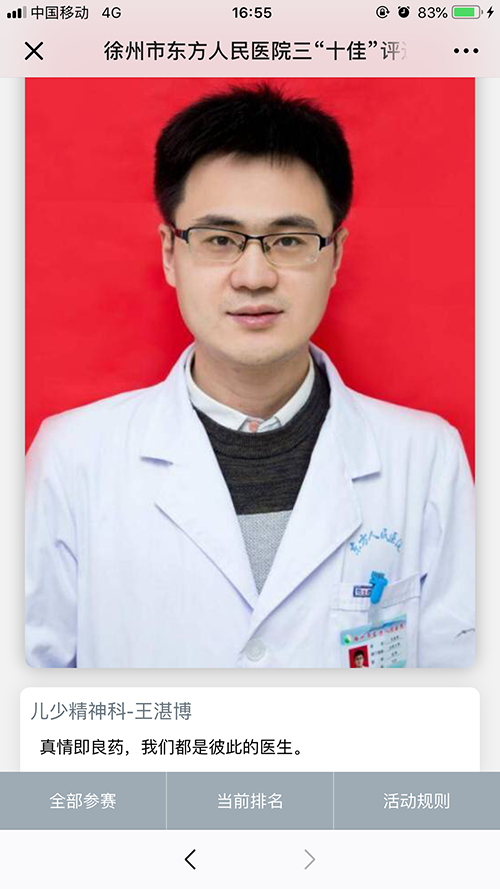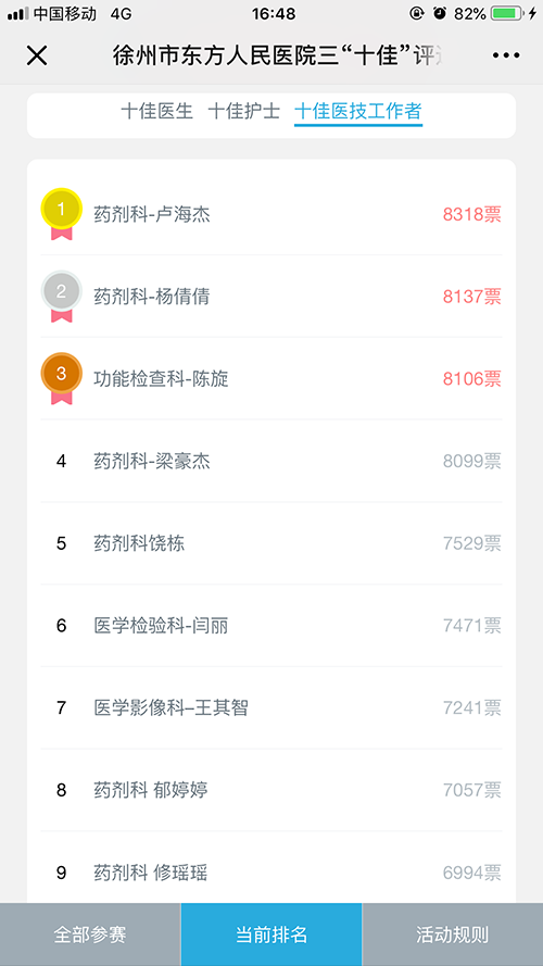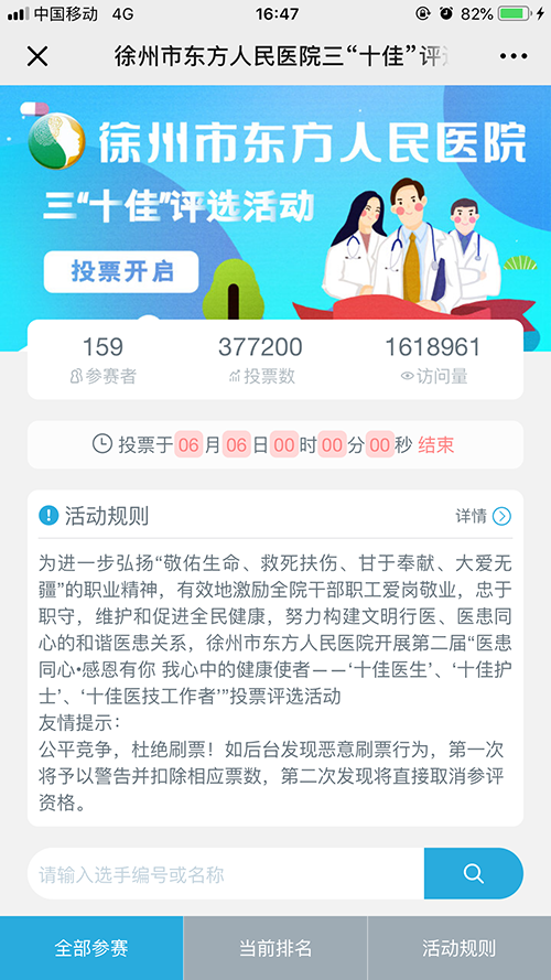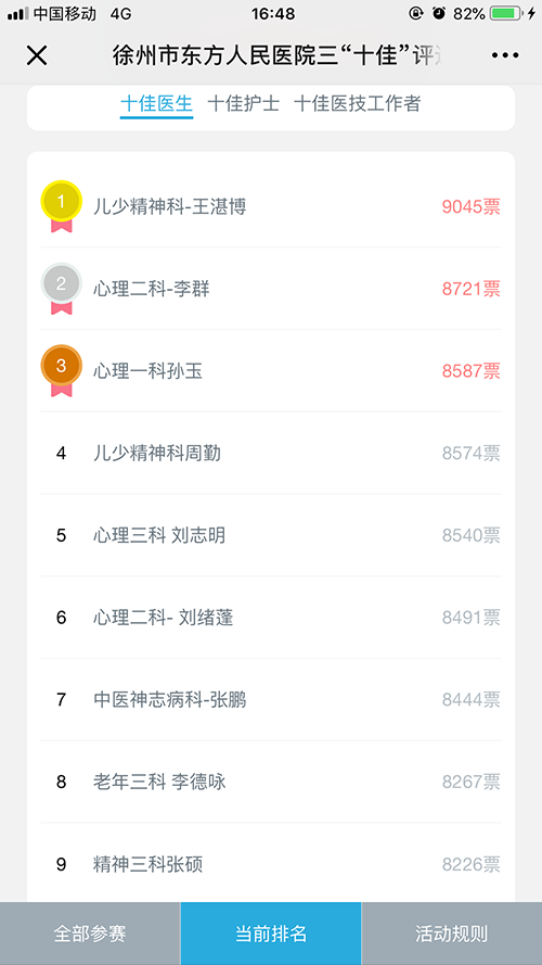 醫(yī)院高度重視三“十佳”評選活動,成立了評選委員會,制訂了評選活動方案與方法,并與5月16日召開動員大會,在醫(yī)院內(nèi)部進行宣傳發(fā)動,鼓勵廣大醫(yī)務(wù)人員積極參與評選。評選活動自2019年5月28日啟動,得到了全院職工積極響應(yīng),有48名醫(yī)生、84名護士、22名醫(yī)技人員積極參加了海選。參選人員熱情高漲,每位選手紛紛在微信朋友圈為自己或為同事投票。歷經(jīng)9天的活動,訪問量為161萬人次,投票人次達37萬,有效地通過多層面、多渠道、多角度宣傳醫(yī)院,讓更多人了解醫(yī)院、關(guān)心醫(yī)院、關(guān)注醫(yī)院,提高醫(yī)院社會知名度、影響力。按照活動方案規(guī)定,海選至2019年6月6日結(jié)束,兒少精神科王湛博等20名醫(yī)生、物質(zhì)依賴科李凡哲等20名護士、藥劑科盧海杰等20名醫(yī)技工作者入圍前20名。