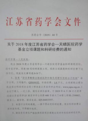 根據(jù)江蘇省藥學(xué)會(huì)文件《關(guān)于2018年度江蘇省藥學(xué)會(huì)-天晴醫(yī)院藥學(xué)基金立項(xiàng)課題和科研經(jīng)費(fèi)的通知》(蘇藥會(huì)字【2019】44號(hào)),徐州市第一人民醫(yī)院藥學(xué)部張曼同志申報(bào)的科研項(xiàng)目《異甘草酸鎂注射液抗纖維化藥理作用的分子機(jī)制》獲得立項(xiàng),編號(hào)Q2019152,資助經(jīng)費(fèi)1.0萬(wàn)。