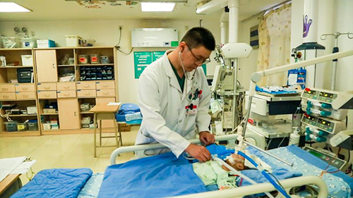 張沖醫(yī)生在給剛做完室缺手術(shù)的三個(gè)月危重患兒檢查身體。