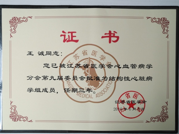 此外,王誠(chéng)主任還當(dāng)選為江蘇省醫(yī)學(xué)會(huì)心血管病學(xué)分會(huì)第九屆委員會(huì)結(jié)構(gòu)性心臟病學(xué)組成員。