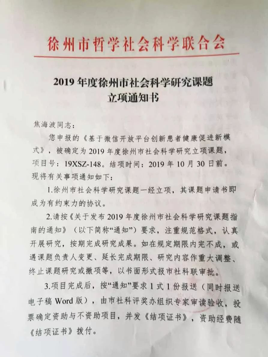 近日,徐州市社科聯(lián)公布了2019年社會科學(xué)研究課題立項結(jié)果的通知,我院焦海波等同志申報的《基于微信開放平臺創(chuàng)新患者健康促進新模式》項目獲得立項。