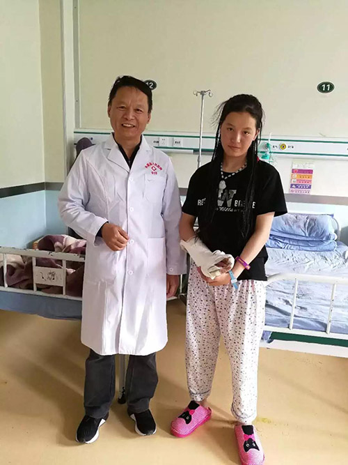 14歲的藏族姑娘才讓卓瑪,一周前曾因右手受刀傷,到醫(yī)院進(jìn)行清創(chuàng)縫合術(shù)治療。而后復(fù)查時,洪士東主任醫(yī)師發(fā)現(xiàn)患者的中指背伸不能,遂確診為右手中指伸肌腱斷離。將患者收入院后,洪士東主任醫(yī)師帶領(lǐng)當(dāng)?shù)毓强漆t(yī)師為患者行右手中指背伸肌腱吻合術(shù)。經(jīng)過手術(shù)治療,藏族姑娘很快痊愈,也露出了開心的笑容。此次洪士東主任醫(yī)師“一戰(zhàn)成名”,越來越多患者慕名而來。