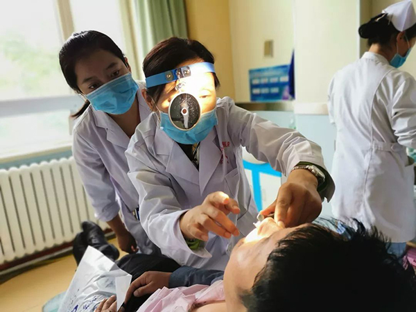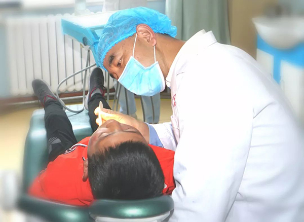 口腔科副主任張紅闖那專注于患者的模樣讓人無法想到他是發(fā)熱感冒喝了正柴胡和清開靈堅(jiān)持工作的。