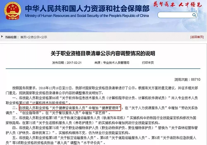 2017年2月人力資源社會保障部《關(guān)于職業(yè)資格目錄清單公示內(nèi)容調(diào)整情況的說明》正式將健康管理師列入水平評價類職業(yè)資格目錄,由衛(wèi)健委負責(zé)具體的考核鑒定工作。