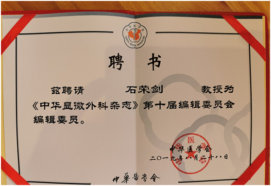 徐州仁慈醫(yī)院石榮劍副院長(zhǎng)當(dāng)選《中華顯微外科雜志》第十屆編委會(huì)委員