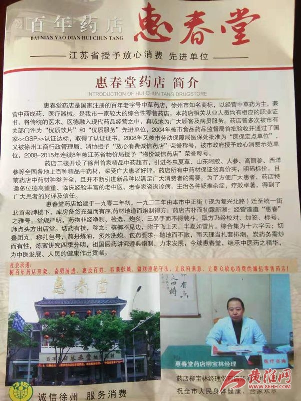惠春堂藥店是國(guó)家注冊(cè)的百年老字號(hào)中草藥店,徐州市知名商標(biāo),以經(jīng)營(yíng)中草藥為主,兼營(yíng)中西成藥、醫(yī)療器械。是徐州市一家較大的綜合性零售藥店。