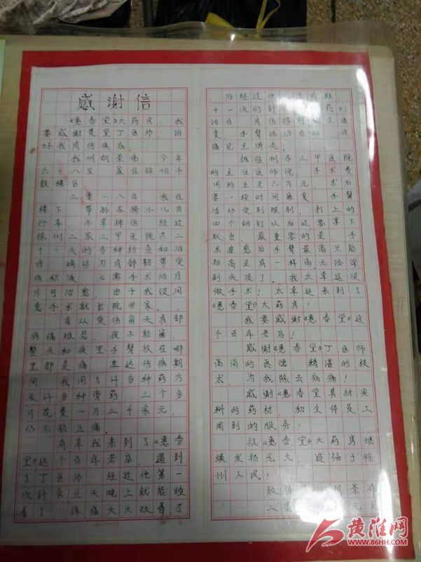 胡先生激動(dòng)地說:“祖國(guó)的中醫(yī)藥療效簡(jiǎn)直太神奇了!太神奇了!一定要把這個(gè)消息宣傳出去,傳遞給廣大百姓。”他在寫給“惠春堂”的感謝信中表示,感謝這個(gè)百年老店,感謝丁良能醫(yī)師的高尚醫(yī)德,精湛的醫(yī)術(shù),為我解除了疼痛的折磨。祝徐州百年“惠春堂”老藥店,再創(chuàng)新的輝煌,造福于廣大徐州市民。