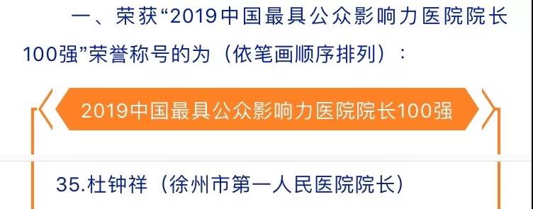 從2019中國醫(yī)療健康影響力排行榜暨十大、100強(qiáng)評選主辦方《醫(yī)醫(yī)團(tuán)》編輯部獲悉,徐州市第一人民醫(yī)院院長杜鐘祥榮獲“2019中國最具公眾影響力醫(yī)院院長100強(qiáng)”榮譽(yù)稱號。徐州市共有3人入選。