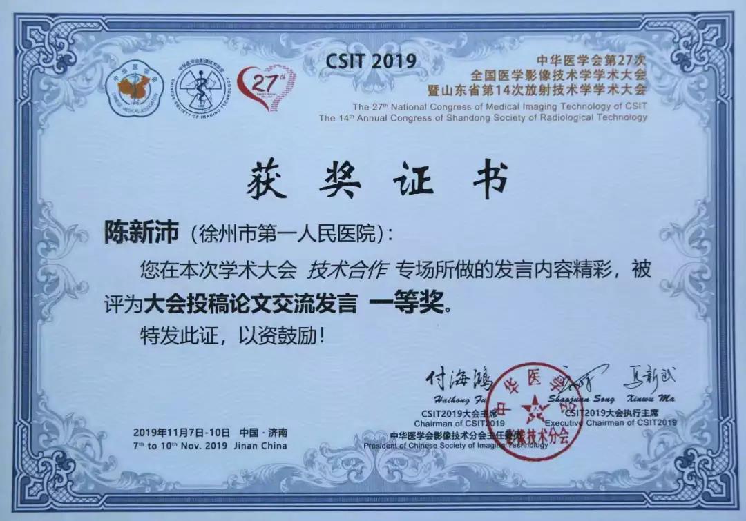 徐州市第一人民醫(yī)院放射科陳新沛主任技師的2篇論文獲全國(guó)醫(yī)學(xué)影像技術(shù)學(xué)術(shù)大會(huì)一等獎(jiǎng)