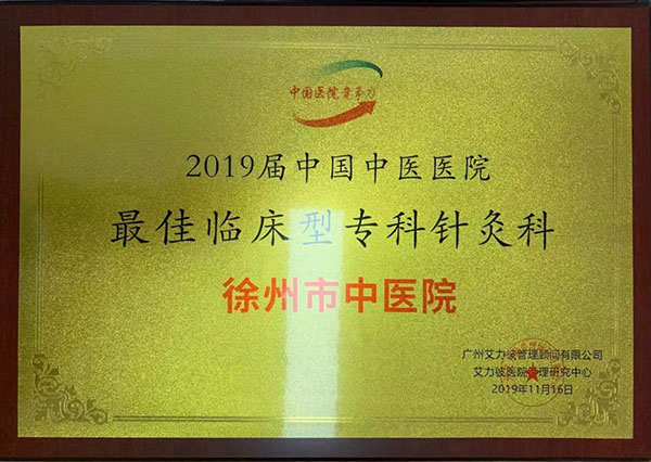 2019年11月16日,中國醫(yī)院協(xié)會中醫(yī)醫(yī)院分會第五屆年會成功召開。艾力彼醫(yī)院管理研究中心在會上發(fā)布了“2019中國中醫(yī)醫(yī)院最佳?” 評選結(jié)果。徐州市中醫(yī)院心血管科(心病科)、針灸科、肛腸科三個專科入選“2019中國中醫(yī)醫(yī)院.最佳臨床型?”,為全國地級市中醫(yī)院入選最佳臨床型?谱疃嗟尼t(yī)院。
