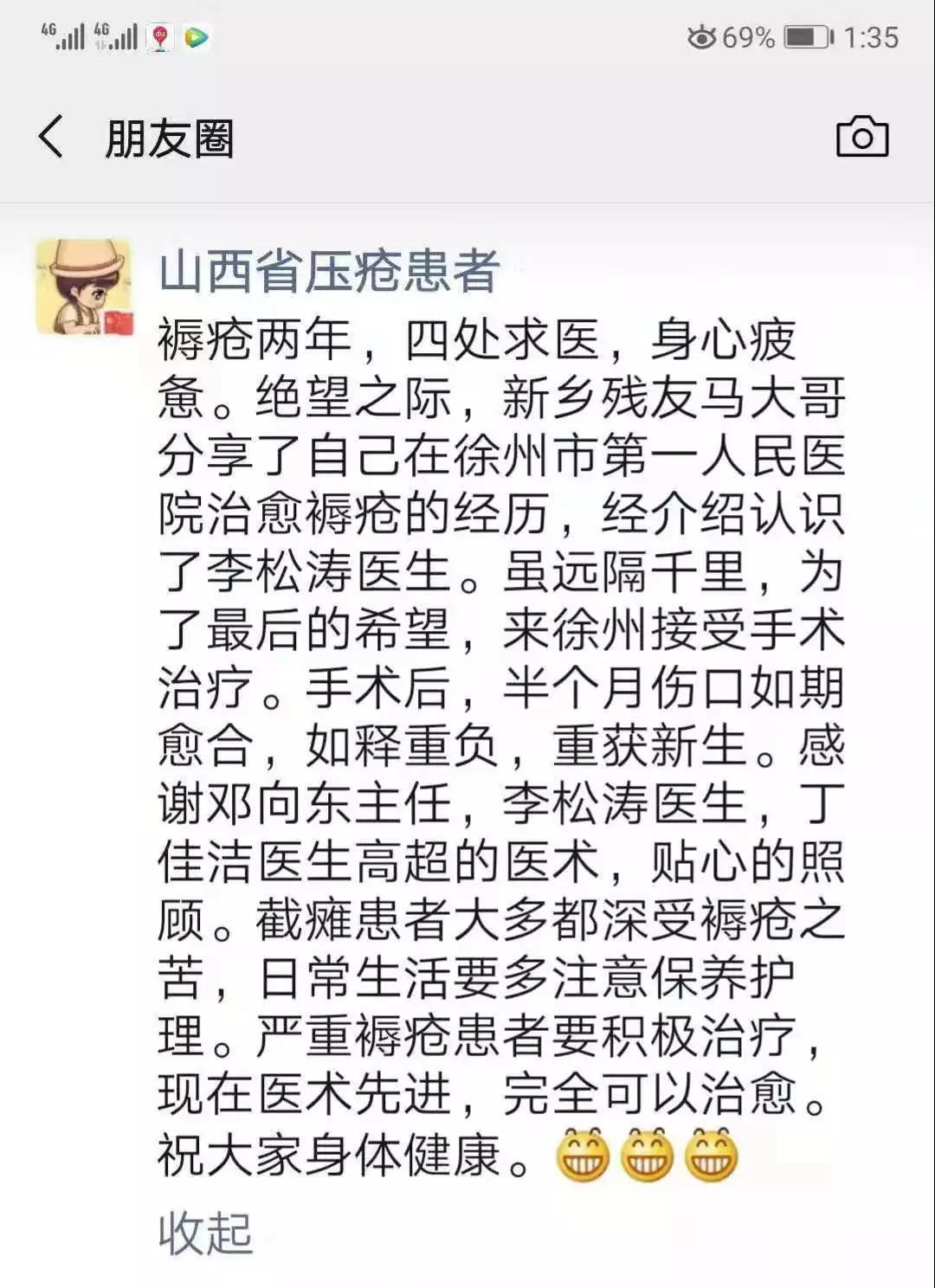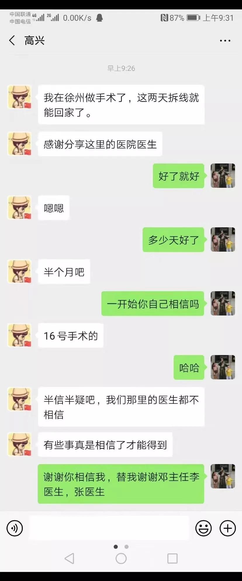 采訪時,偶遇小王的患友——徐州志愿者朋友吳師傅來看他。吳師傅給我們講了一個與小王結(jié)緣的故事:“我和小王都患有先天性脊柱裂。先天性脊柱裂因為伴有神經(jīng)損傷,常突發(fā)“無痛性”壓瘡,無法預(yù)防。小王因為這次壓瘡2年多不愈,之前曾看到過市一院成功治療多例壓瘡的報道,也有病友分享在市一院治療壓瘡的經(jīng)歷,但仍心存顧慮,在微信群里想咨詢徐州患友。我看到后就和他保持聯(lián)系,并且告訴他,我在市一院的親身就醫(yī)經(jīng)歷。在我出生40天后,父母帶我來到市一院看病,當(dāng)年是市一院的專家為我親自做的脊柱裂手術(shù),手術(shù)非常成功。近幾年我加入了好幾個先天性脊柱裂患友微信群,經(jīng)常到全國各地參加很多講座活動。據(jù)我了解,目前先天性脊柱裂患者術(shù)后生存率超過50年的并不多,在群里比我年齡大的也不多,我?guī)缀蹩梢哉f是“元老”了。別看我拄著拐杖,我還經(jīng)常外出旅游,曾經(jīng)登上過泰山,很多人佩服我,我感到很自豪。感謝市一院專家的精湛醫(yī)術(shù),讓我擁有今天的美好生活......相信市一院燒傷科一定會治好你的病。”吳師傅的話語充滿陽光、感恩與信任。就這樣,聽了吳師傅的建議后,因為信任,小王和家人更是堅定了奔赴千里尋醫(yī)的決定。