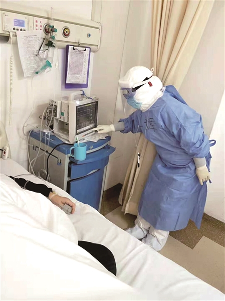 在隔離病房里,聽到最多的就是咳嗽聲。在跟病人近距離接觸時(shí),雖然穿著防護(hù)服,聽到病人咳嗽,心里還是會(huì)本能怵一下,但是她們誰(shuí)也不會(huì)因?yàn)楹ε露丝s或躲閃。