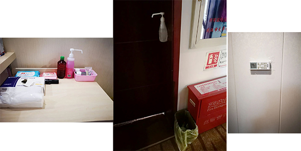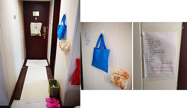 工作前要做好準備工作,備好消毒水及干凈衣物,方便回來時使用,上班前一定要按照清單清點物品,以防遺漏可以將清單上墻,將上班需要的物品用雙層塑料袋封閉,下班后在醫(yī)院更換外層塑料袋,回來后先在賓館門口進行全身及塑料袋的消毒,在門口時更換工作鞋,將外層衣物掛在門外,門口可以放瓶手消液,消毒手后將口罩帽子放在門口垃圾桶內(nèi),消毒手及房卡后進門,消毒衣物,洗澡,然后洗衣物,拖地,這樣更能節(jié)約時間。