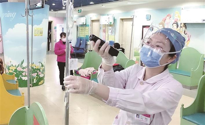 “我們將原先能容納400人的座椅撤掉了一半,就為了加大座椅的間隔,現(xiàn)在座椅間的距離基本在兩米左右。”輸液室護(hù)士長(zhǎng)祖靜告訴記者,近段時(shí)間,輸液室每天的人流量在100人次左右,通過(guò)提前引導(dǎo)輸液患兒錯(cuò)時(shí)來(lái)院,同一時(shí)間段內(nèi),輸液家庭不會(huì)超過(guò)15組。并且,針對(duì)普通發(fā)熱患兒,他們?cè)O(shè)有專(zhuān)門(mén)的輸液區(qū),可保證與不發(fā)熱患兒隔離開(kāi)來(lái)。