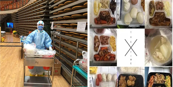 護理人員負責餐食的發(fā)放,病人以一排為單位,選定一個組長領飯。每日三餐的進餐時間分別是7點、12點、18點。方艙每天的伙食質(zhì)量很好。早餐一般是面點雞蛋牛奶,午晚餐是3葷1素,外加一碗湯或者一個水果。午餐、晚餐很豐富,有盒飯、自嗨鍋、酸奶,還有水果,可以保證患者日常所需的各類營養(yǎng)元素。