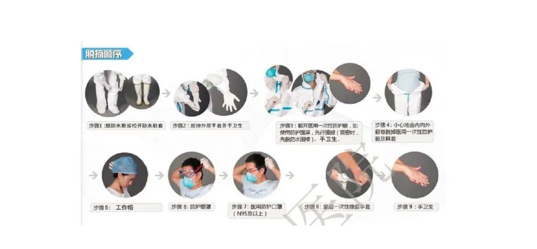 整個程序需要13次手衛(wèi)生消毒,每個手衛(wèi)生操作都對應相關的脫防護服的操作。每一個步驟都要格外謹慎,醫(yī)務人員在最簡陋的條件下進行著最嚴謹?shù)母綦x消毒!